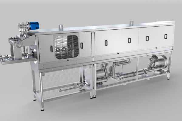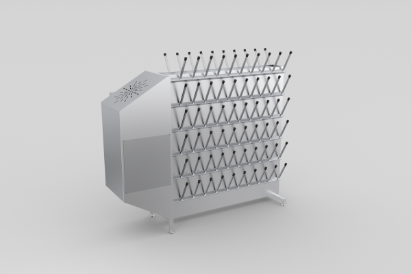 - Мойка вёдер щелочным раствором. Изнутри и снаружи ведра производится мойка форсунками. Концентрация раствора поддерживается автоматически дозирующим насосом. Мойка производится нагретым щелочным раствором. Температура поддерживается автоматически.Ополаскивание чистой водой. Во время цикла – оборотной холодной водой, при переходе в секцию обдува ведро проходит сквозь рамку с проточной водой.