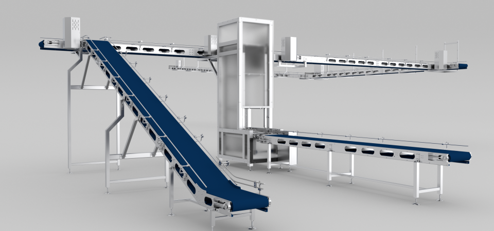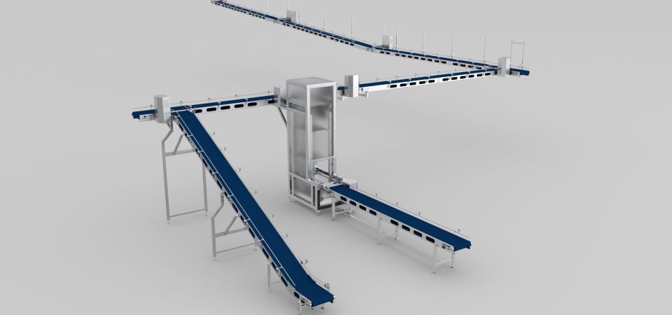 Элеватор работает в транспортных линиях перемещения пластиковых ящиков, гофро-коробов, термоупакованной и иной тары.