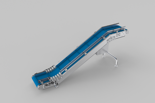 Транспортировочная лента имеет автоматическое гравитационное натяжное устройство, на ленте имеются поперечные перегородки для предотвращения скольжения продукта на наклонных участках. Для обеспечения плавности движения ленты места подъема оборудованы роликовыми направляющими.